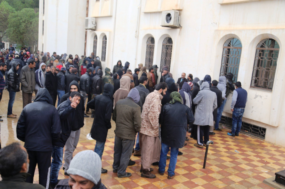 أغلب الحاضرين حجزوا أماكنهم منذ منتصف الليل، على أمل الحصول على نصيبهم من السيولة التي أعلنت السلطات المحلية وصولها من البنك المركزي في طرابلس العاصمة إلى المدينة وتوزيعها على فروع البنوك.