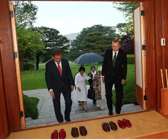 ولم تكن الصورة التي جمعت أردوغان بالطفلة فقط ما انتشر عن رحلته التي استمرت يومين في كوريا الجنوبية، بل انتشرت أخرى له وهو يزور أحد المنازل الكورية التقليدية برفقة زوجته.