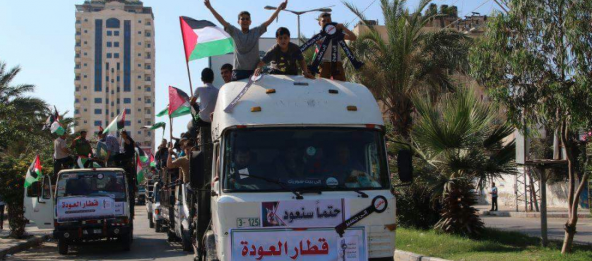 العشرات من اللاجئين الفلسطينيين تجمَّعوا في ساحة الكتيبة وسط غزة، واستقلّوا حافلات كبيرة، حملت كل حافلة اسم قرية من قرى فلسطين “المجدل– حمامة– يبنا– بيت دراس– يافا– حيفا”، وجابوا شوارع قطاع غزة وصولاً الى مخيمات العودة شرق القطاع.