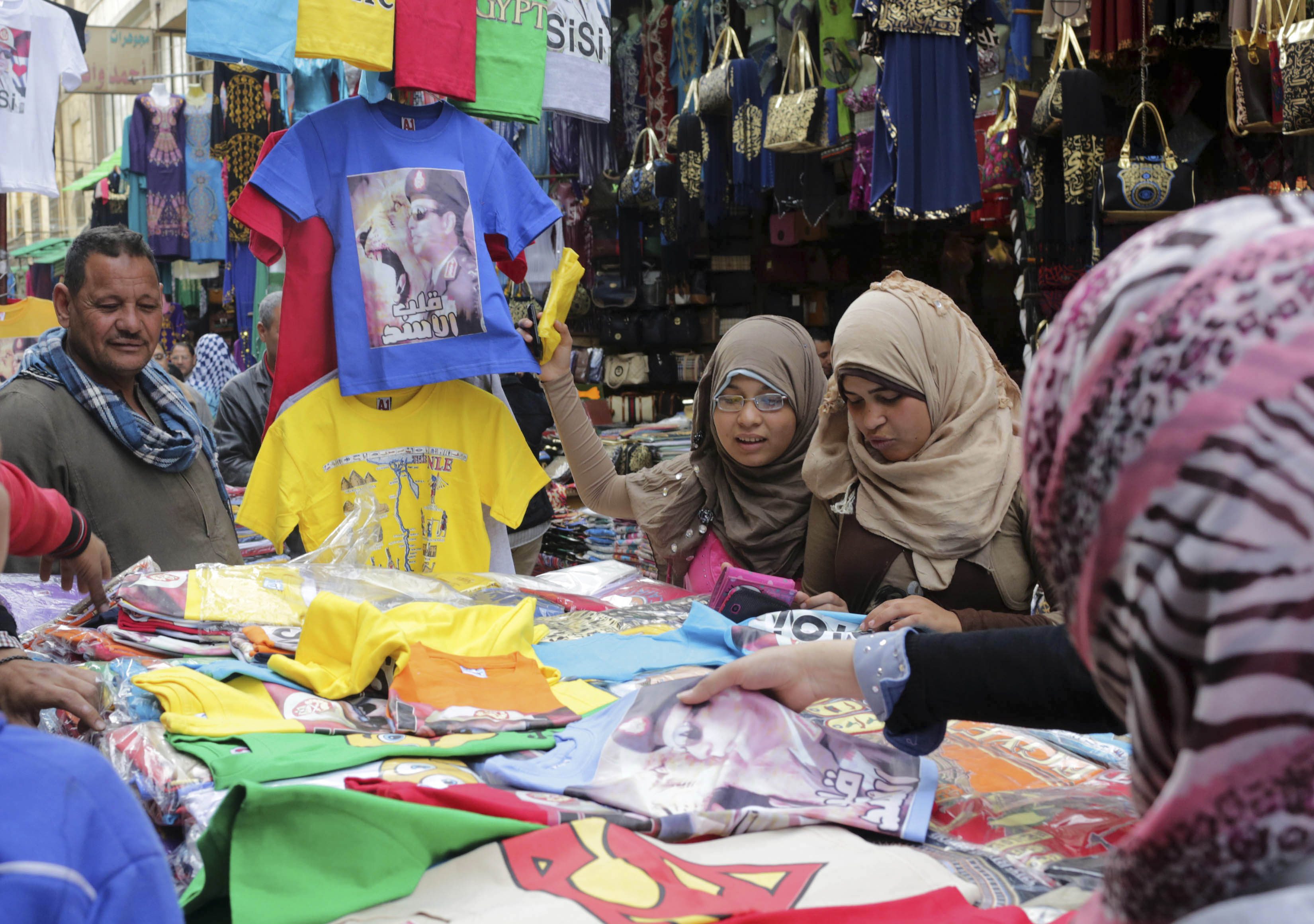 People buy t-shirts with pictures of Egypt's army chief Field Marshal Abdel Fattah al-Sisi from a street vendor in central Cairo March 11, 2014. REUTERS/Asmaa Waguih (EGYPT - Tags: SOCIETY)