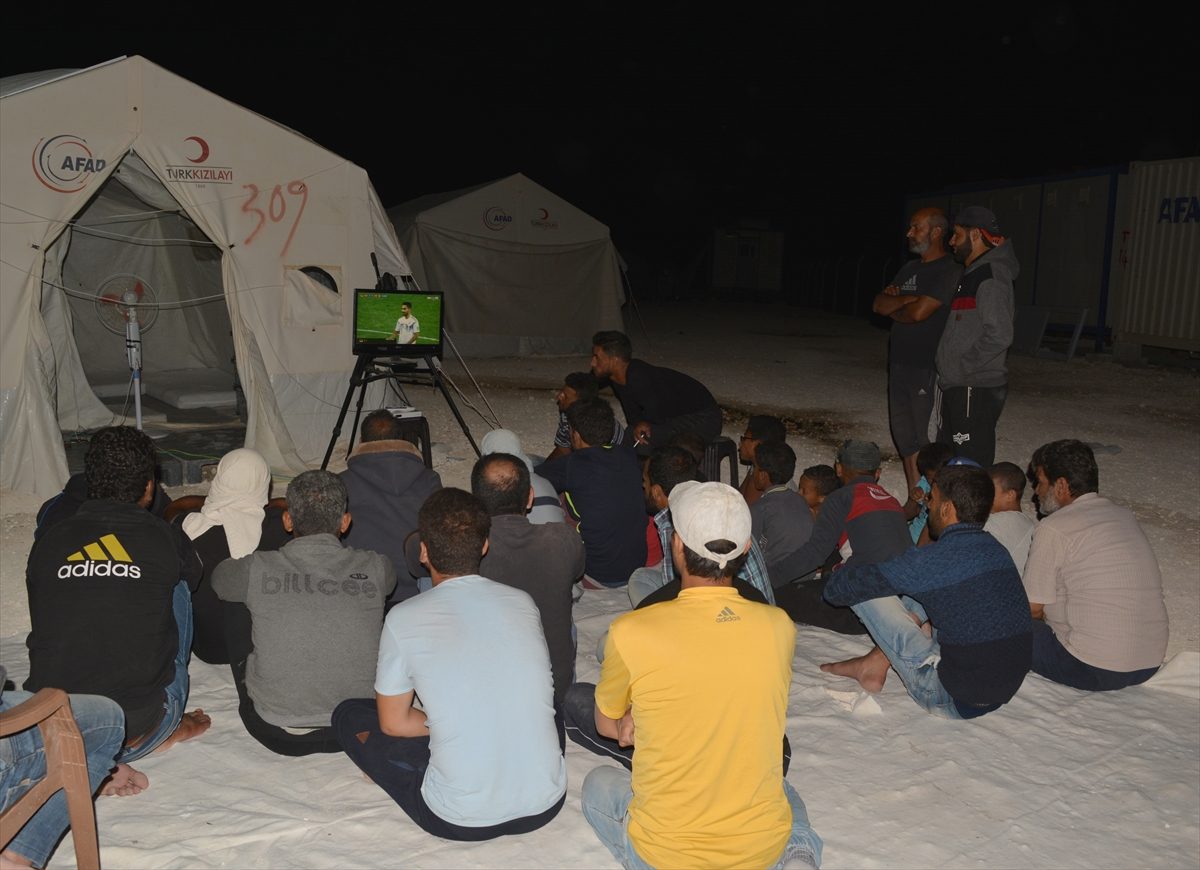 “رامي السيد”، أحد الناشطين السوريين النازحين القلائل الذي يملكون شاشة تلفاز، مع جهاز بث مباشر، يقوم بوضعه نهاراً داخل خيمته وليلاً خارجها، ويستقبل يومياً عشرات المشجعين.