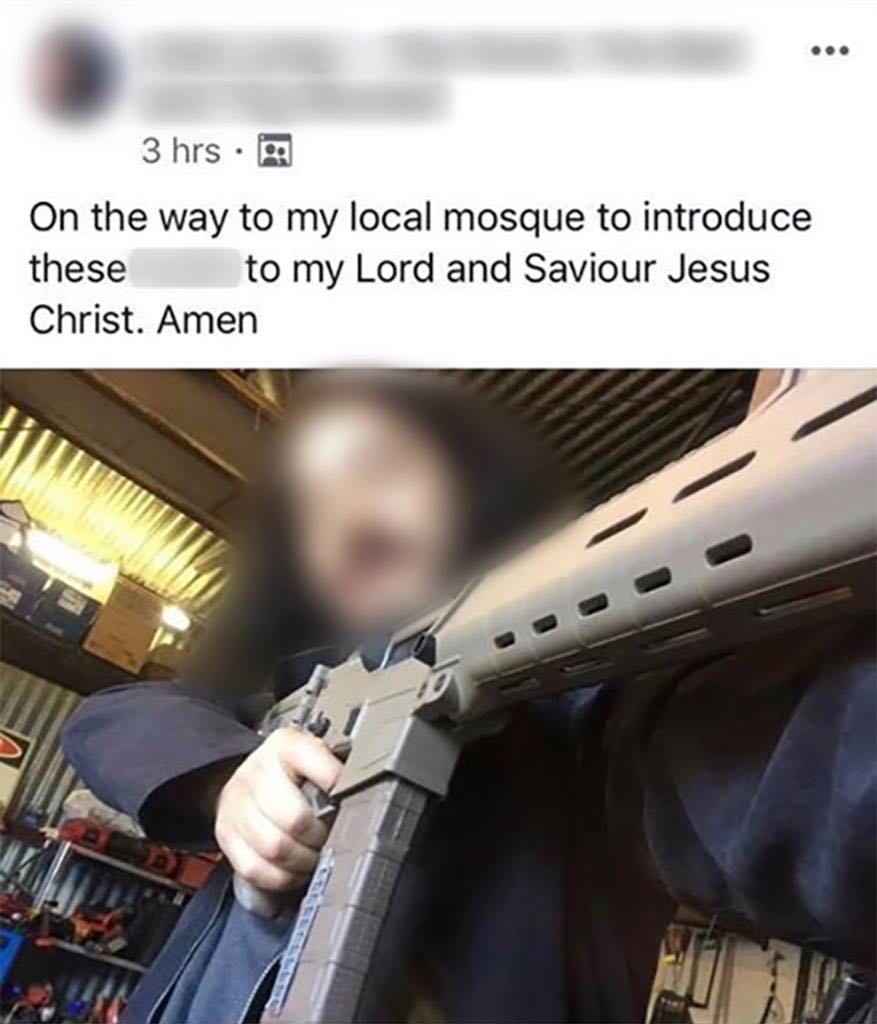 وكتب الرجل في منشوره: “أنا في طريقي إلى مسجدي المحلِّي لأُطلِع هؤلاء الـ*** على يسوع المسيح، ربِّي ومُخلِّصي”، وأرفق مع كلماته صورةً له ظهر فيها ممسكاً ببندقيةٍ آليةٍ كبيرة.