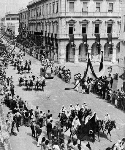 شارع عمر المختار في العاصمة طرابلس سنة 1944، ملامح المكان تبدو كأنها قطعة من مدينة أوروبية؛ السيارات منتظمة في مواقفها، السائقون يحترمون الإشارات الضوئية والمشاة على الرصيف، وشرطي المرور في مكانه يراقب الوضع.