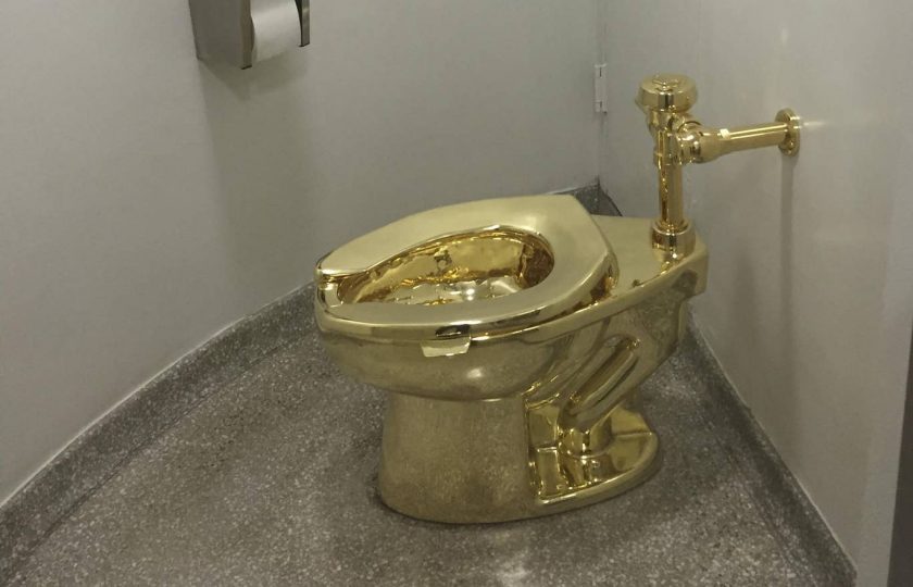 مرحاض من الذهب: كشفت صحيفة The Evening Standard البريطانية عن تركيب مرحاض من الذهب عيار 18 قيراطاً في قصر بلينهايم في بريطانيا ليستخدمه الزائرون، لكن يتعين عليهم احترام مهلة زمنية صارمة للاستخدام. ومن المقرر أن تعرض المراحيض التي أنشأها الفنان الإيطالي موريزيو كاتيلان في منزل أوكسفوردشاير الفخم في سبتمبر/أيلول 2019 .