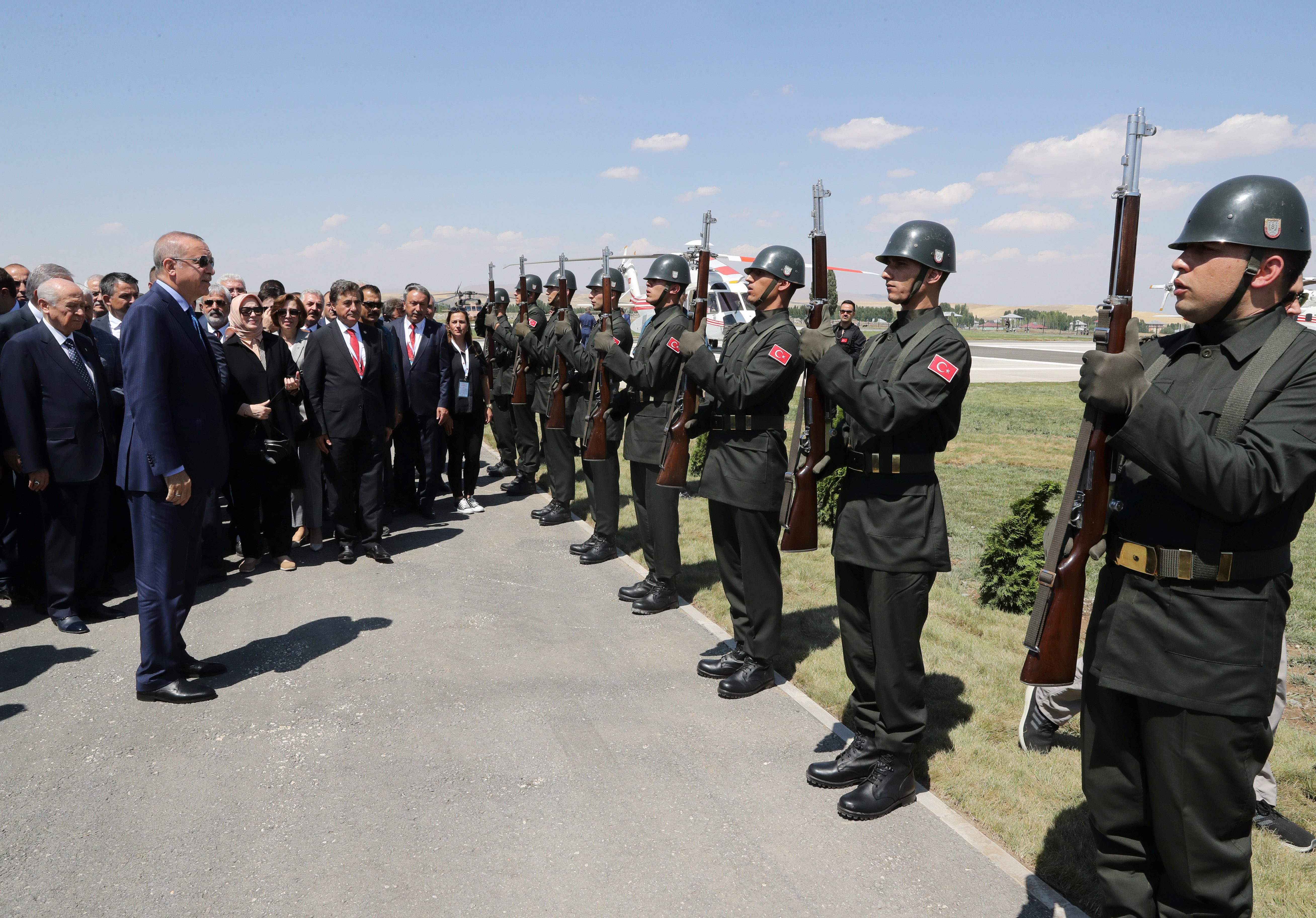 رجب طيب أردوغان يستعرض حرس الشرف لدى وصوله في أحد الاحتفالات/ رويترز