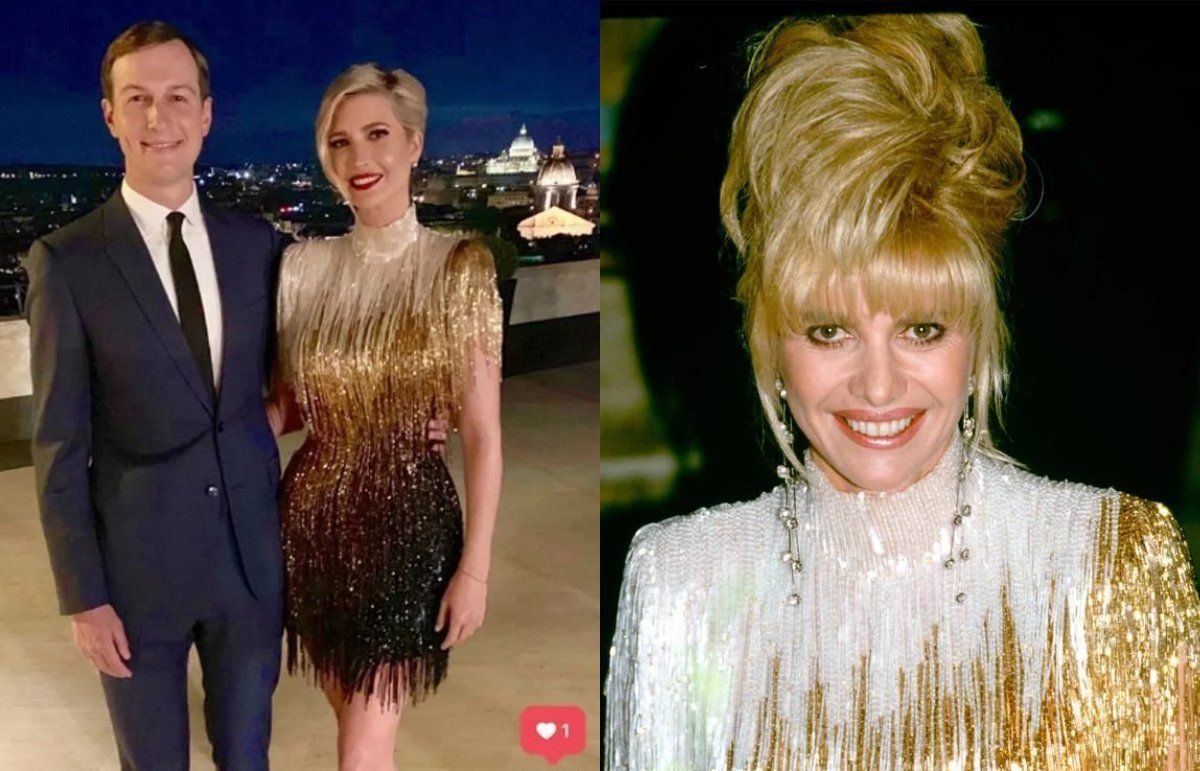 إيفانكا ترامب: ارتدت ابنة الرئيس الأمريكي إيفانكا ترامب فستان والدتها ميلانيا، الذي سبق أن ارتدته في إحدى المناسبات قبل 28 عاماً. وقالت تقارير إنه تمَّ تصوير إيفانكا (37 عاماً) وهي ترتدي فستاناً فائق الأناقة من تصميم المصمم الأمريكي بوب مكي، أثناء حضور الليلة الثانية لحفل زفاف مصممة الأزياء ميشا نونو في روما.
