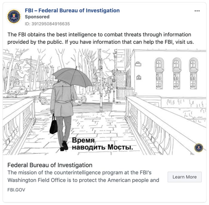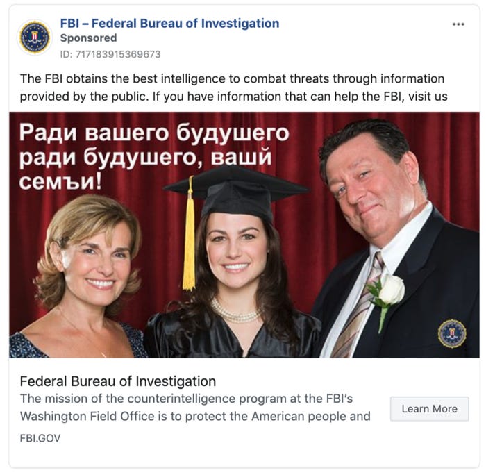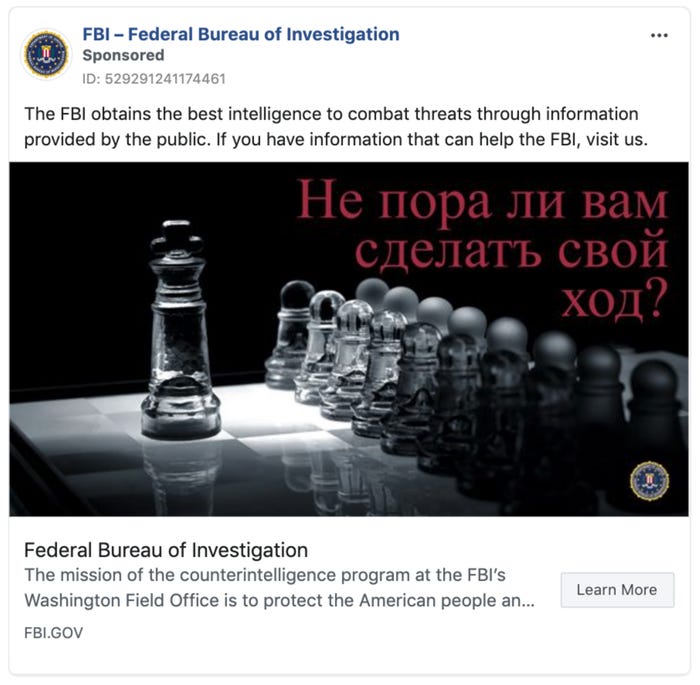 ونشرت إعلانات مكتب التحقيقات الفيدرالي الثلاثة على فيسبوك باللغة الروسية: