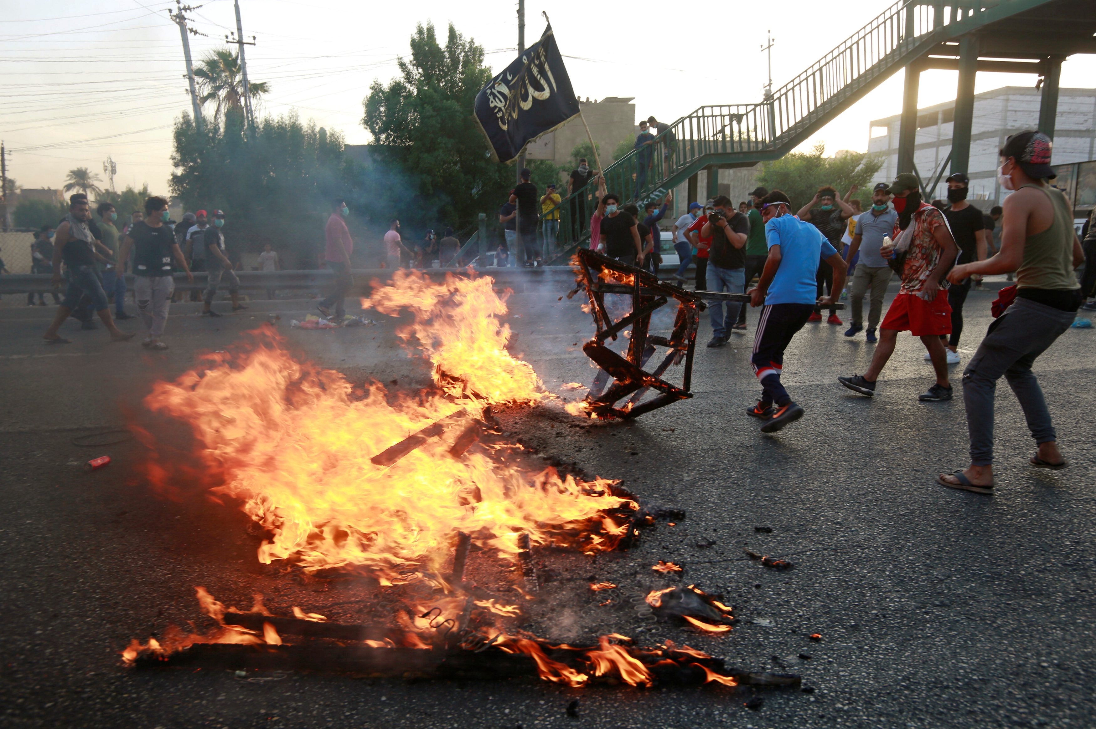 خلفية: كانت المظاهرات قد بدأت في بغداد، يوم الثلاثاء الماضي، وسرعان ما تضخمت وانتشرت في مدن أخرى أغلبها بالجنوب. وأطلقت الشرطة الذخيرة الحية والغاز المُسيل للدموع ومدافع المياه لتفريق المحتجين. وصب المحتجون جامّ غضبهم على الحكومة والنخبة السياسية التي يتهمونها بالفساد وعدم فعل شيء لتحسين أحوالهم المعيشية.