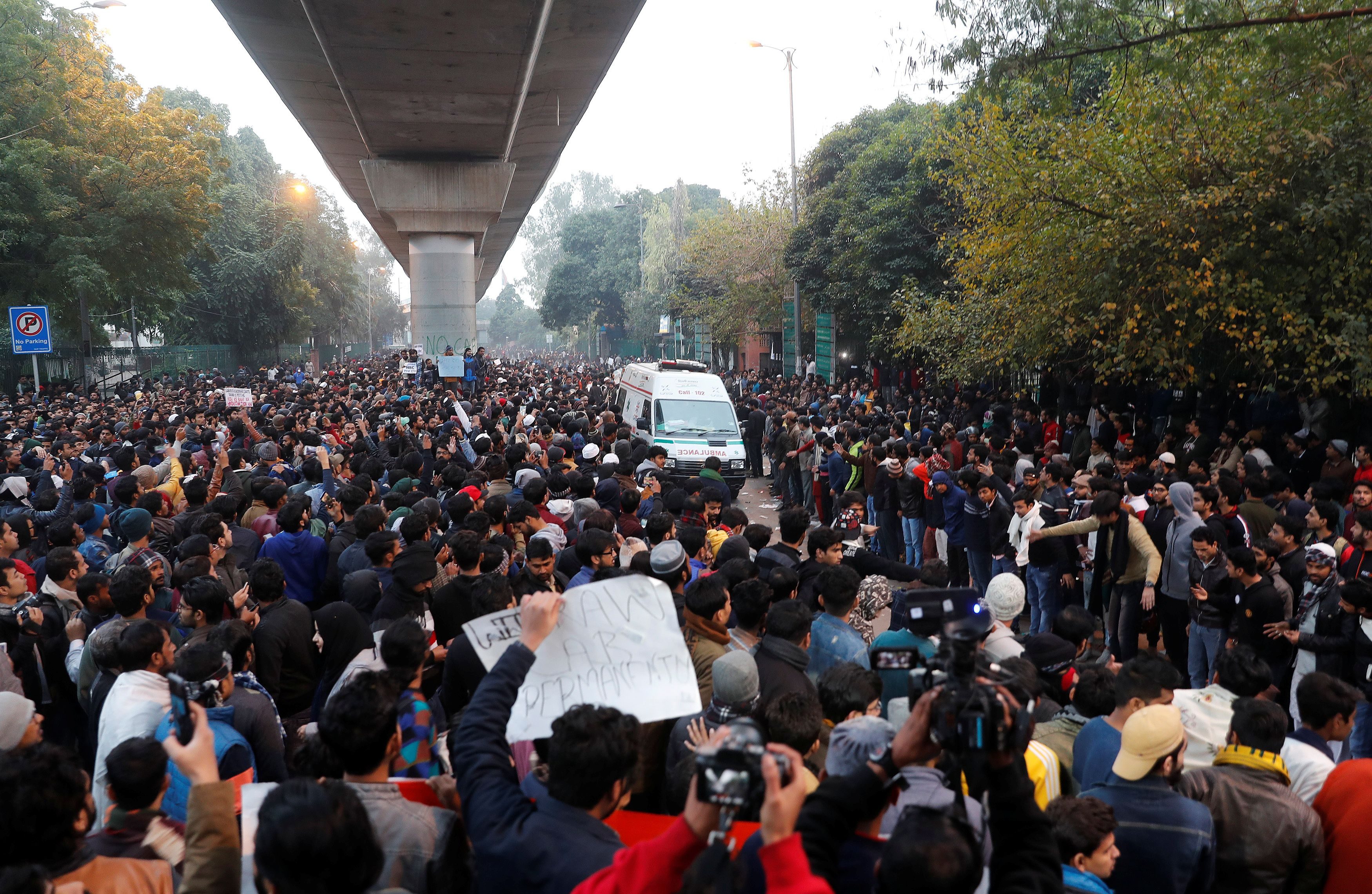 انتشرت الاحتجاجات على قانون جديد للجنسية يستند إلى الدين، لتشمل جامعات في أنحاء الهند، الإثنين 16 ديسمبر /كانون الأول 2019، في حين قال منتقدون إن حكومة رئيس الوزراء، ناريندرا مودي، تدفع ببرنامج قائم على التعصب، بما يتعارض مع تأسيس الهند كجمهورية علمانية.