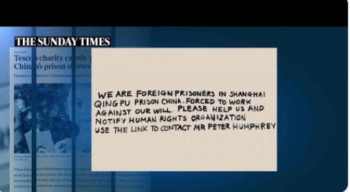 كُتب على البطاقة: “نحن سجناء أجانب في سجن شنغهاي كينغبو، يتم إجبارنا على العمل خارج إرادتنا، رجاءً ساعدونا وبلغوا منظمات حقوق الإنسان”.