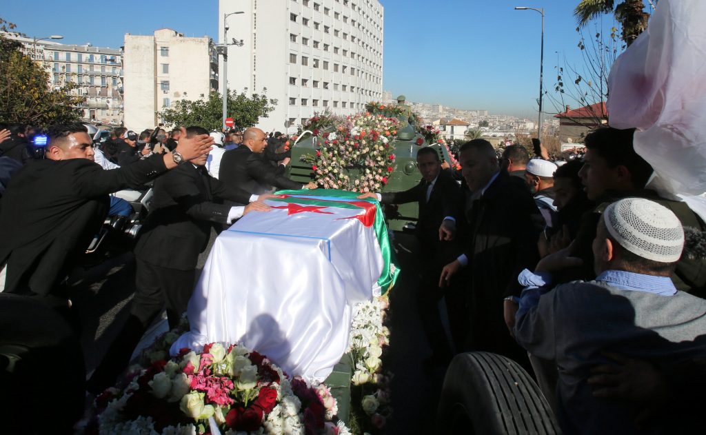 حيث تقدَّم الرئيس الجزائري الجديد عبدالمجيد تبون، المشيعين في مربع الشهداء (يُدفن فيها قادة تاريخيون للبلاد) بمقبرة العالية شرق العاصمة، إلى جانب كبار المسؤولين السياسيين والعسكريين.