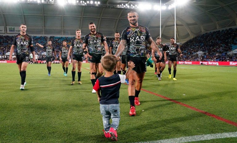 تهلل الحشد في ملعب روبينا في مدينة غولد كوست الأسترالية فور رؤيتهم كوادين يسير جنباً إلى جنب مع جويل تومسون قائد الفريق قبل مباراته ضد فريق دوري الرغبي النيوزيلندي ماوري أول ستارز.
