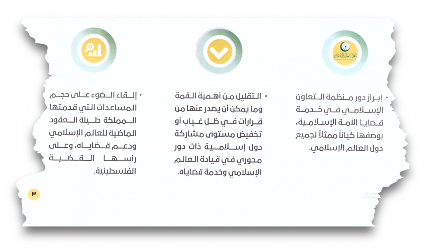 في حين تُشير الوثيقة إلى أنّ الغرض الأساسي من حملتهم هو “التقليل من أهمية القمة وما يُمكن أن يصدر عنها من قرارات، في ظل غياب أو تخفيض مستوى مشاركة دول إسلامية ذات دورٍ محوري في قيادة العالم الإسلامي وخدمة قضاياه”.
