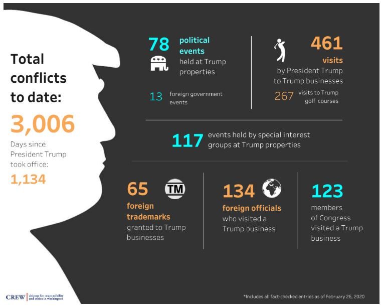 نشرت منظمة Citizens for Responsibility and Ethics في واشنطن تقريراً، الجمعة 28 فبراير/شباط، وصفت فيه وجود الرئيس دونالد ترامب في البيت الأبيض بأنه “كارثة أخلاقية”، وعرضت قائمة بـ3000 حالة تمثل تضارب مصالح بين صفقات ترامب التجارية وتوليه الرئاسة. أي بمتوسط نحو 2.5 حالة تضارب مصالح يومياً.