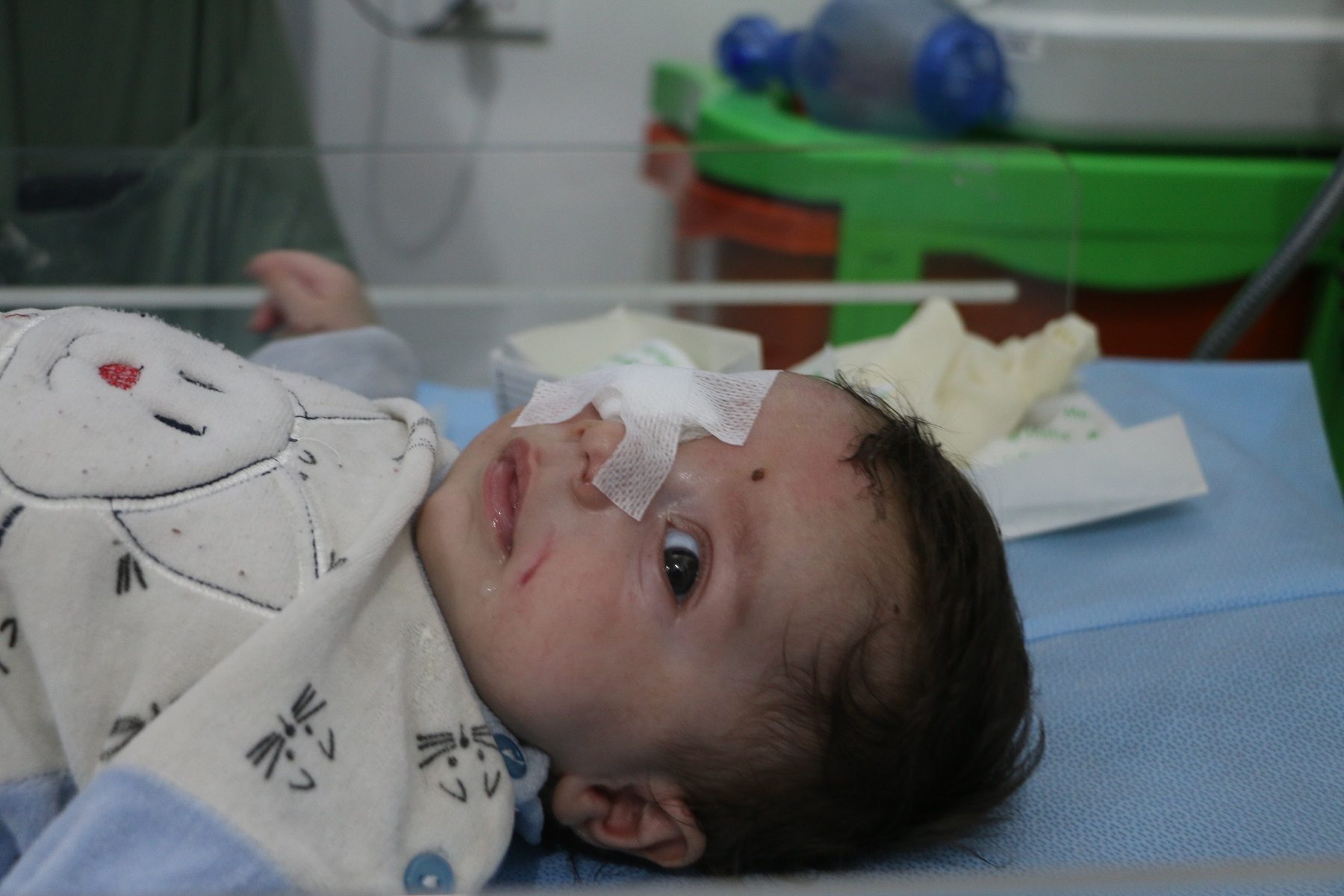 رضيع سوري فقد عينه لتظل شاهدة على إجرام الأسد.. ابن الشهرين أصيب بشظايا قذيفة في منزله