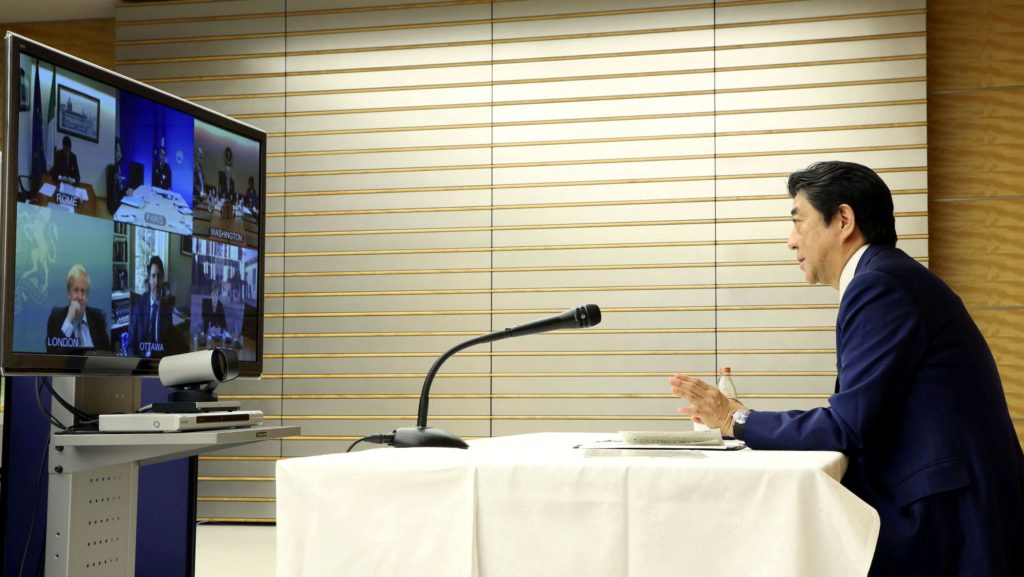 إذ ظهر كل من الرئيس الأمريكي دونالد ترامب، ورئيس الوزراء الكندي جاستن ترودو، والمستشارة الألمانية أنجيلا ميركل، والرئيس الفرنسي إيمانويل ماكرون، ورئيس الوزراء البريطاني بوريس جونسون، ورئيس الوزراء الياباني شينزو آبي، ورئيس الوزراء الإيطالي جوزيبي كونتي في مكالمة فيديو في صورة نشرها الصحفي ألفين لوم على موقع تويتر.