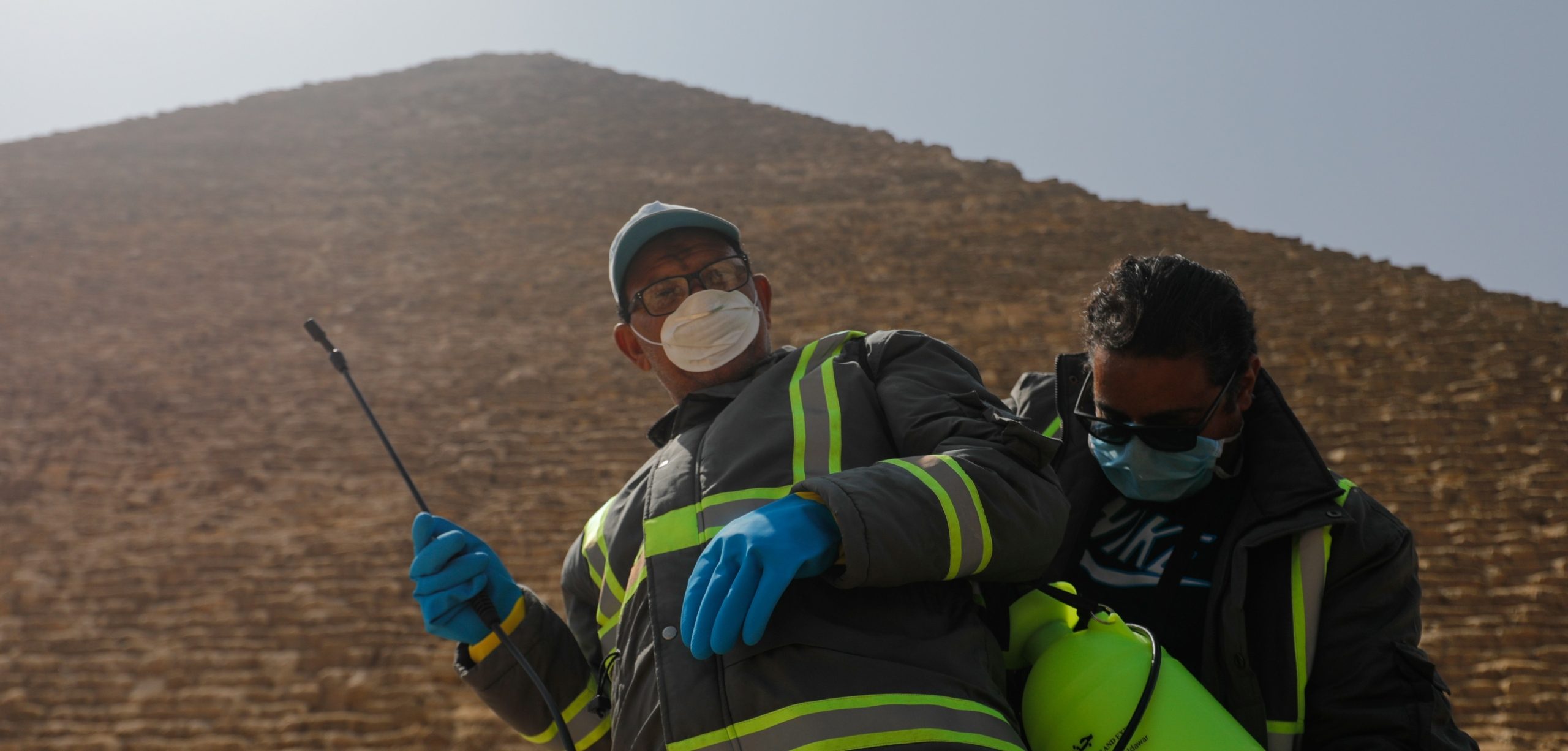 في حين نشرت وسائل إعلام مصرية صوراً ملتقطة لعمال يعقّمون محيط الأهرامات في محافظة الجيزة.