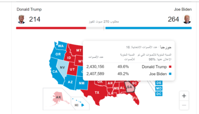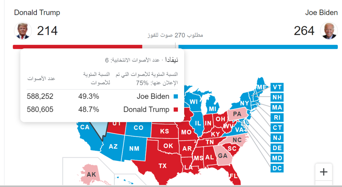 من الأقرب للفوز؟ تظهر الأرقام، حتى كتابة هذا التقرير، أن المرشح الديمقراطي هو الأقرب إلى منصب رئاسة الولايات المتحدة، فهو بحاجة فقط إلى 6 أصوات، من المتوقع أن يحصل عليها من ولاية نيفادا، التي يتقدم فيها بشكل ضئيل على منافسه ترامب، حيث يفصل بينهما حتى اللحظة فقط 8 آلاف صوت تقريباً، وهو ما يعني أن النتائج قد تنقلب في أي لحظة.