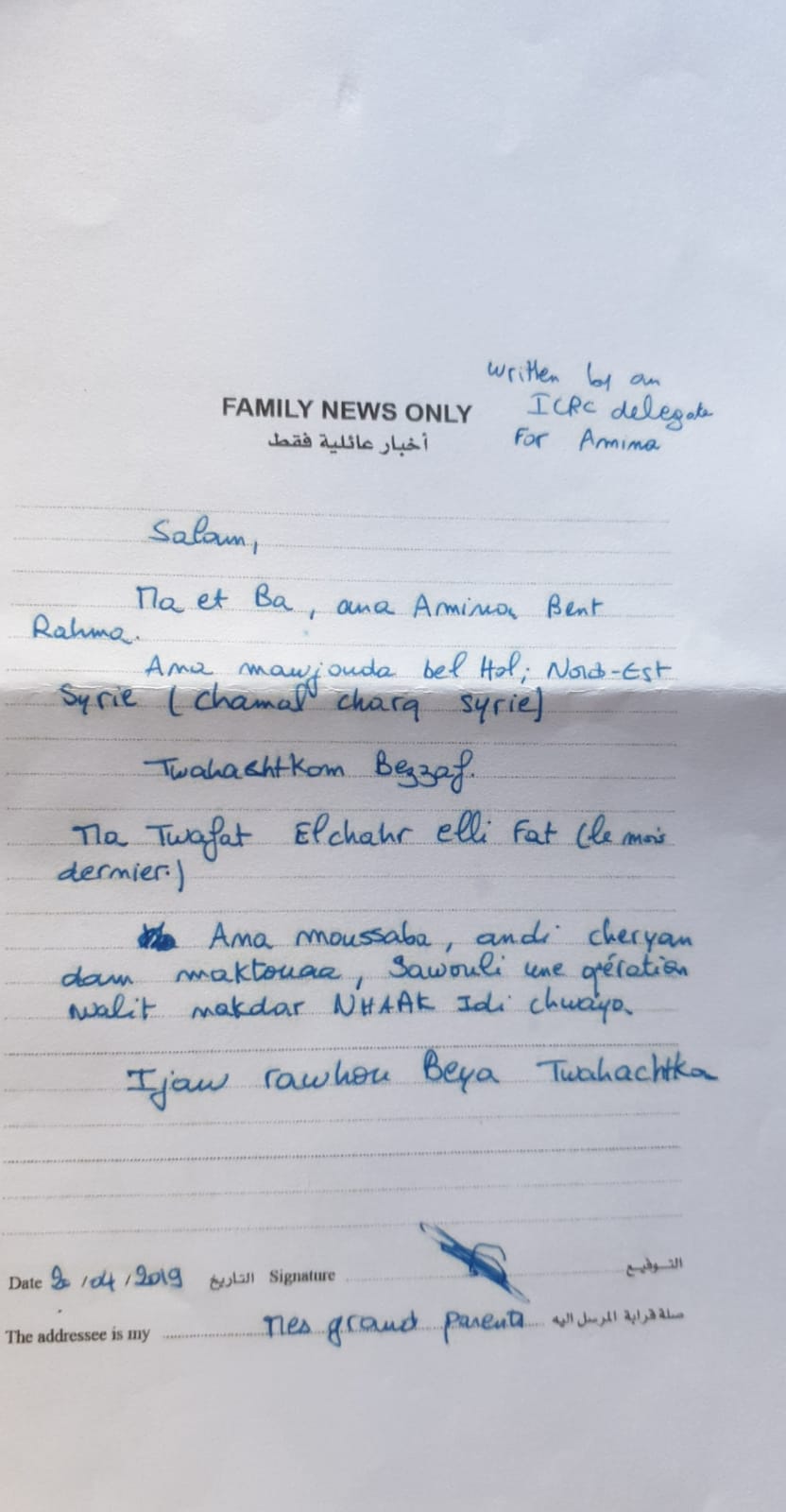 وأضاف المتحدث أنه توصل برسالة من إحدى ابنتيه القاصر سلمها لـ”عربي بوست” تخبره من خلالها أن والدتها توفيت وأنها أُصيبت بدورها في يدها وأجريت لها عملية جراحية، كما تؤكد أنها اشتاقت كثيراً لعائلتها وتطلب التدخل لإنقاذها من جحيم المخيم.