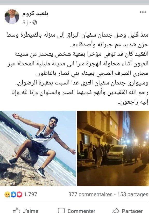 “إذا توفيت قبل أمي فأخبروها أن أمنيتي قد تحققت”.. عبارة بعثها الشاب المغربي سفيان البراق المنحدر من مدينة القنيطرة إلى بعض أفراد عائلته قبل أيام من وفاته رفقة شاب آخر خنقاً أثناء محاولته الهجرة عبر قنوات الصرف الصحي من المغرب باتجاه إسبانيا.