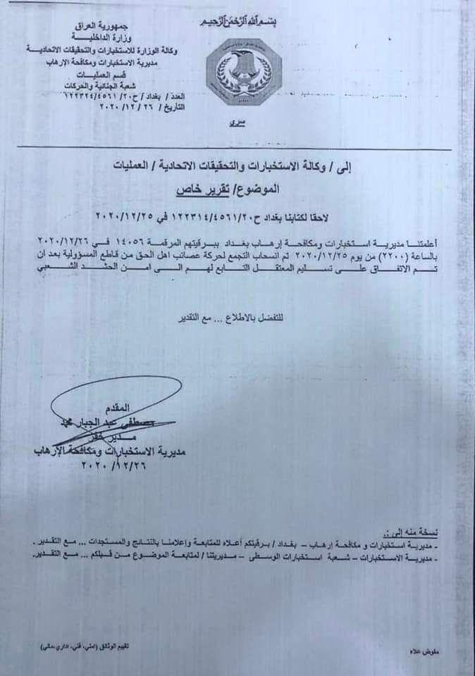 وبعد أقل من عدة ساعات، هددت عصائب أهل الحق، بمحاصرة المقار الأمنية العراقية، في سبيل الضغط للإفراج عن القائد المعتقل، وبالرغم من نفي المسؤولين الأمنيين لهذا الأمر في وسائل الإعلام، إلا أن “عربي بوست” حصل على وثيقة، تتضمن عكس ما أشيع في وسائل الإعلام.