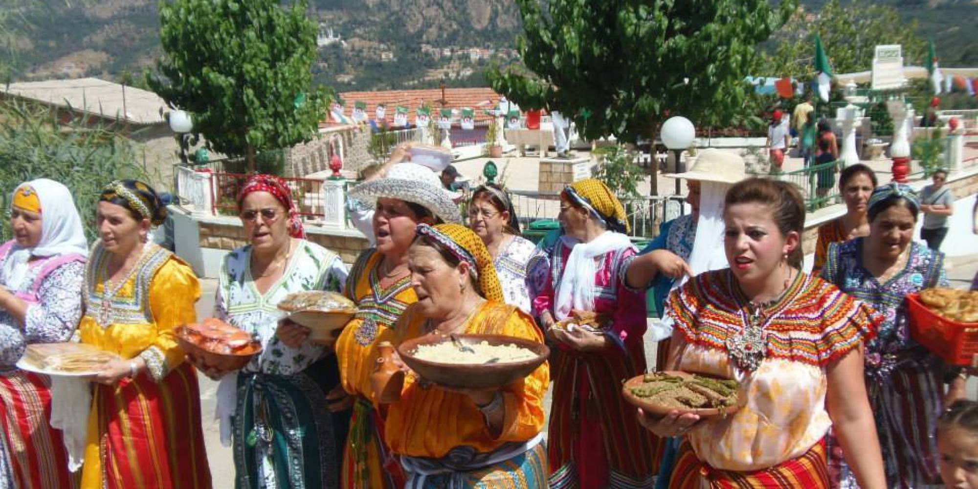 ومن بين الأطباق الأمازيغية التي يُعدها أمازيغ الجزائر طبق “شخشوخة” و”الرشتة”، و”بركوكس”، و”التراز” هذا الأخير الذي يُعد طبقاً أمازيغياً أصيلاً يتم تحضيره بخلط الحلويات والتمر والفواكه الجافة.