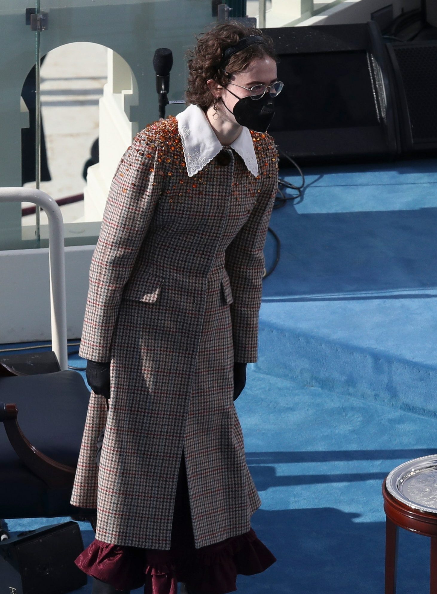 حيث ظهرت بسترة ذات نقش على هيئة مربعات، مع التضييق من منطقة الخصر والياقة البيضاء المحددة والتطريزات المتلألئة، كما حظيت قطعة الصوف بالثناء منذ اللحظة التي نزلت فيها إيلا على الدرج بمبنى الكابيتول.