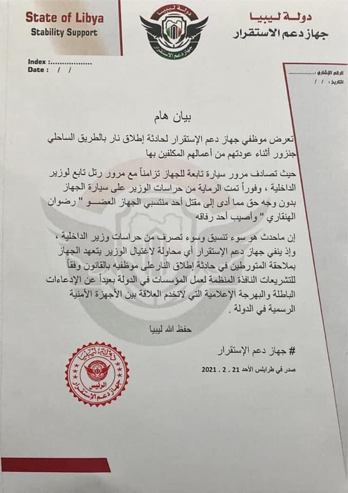 أكد بيان لجهاز دعم الاستقرار تعرض موظفي جهاز دعم الاستقرار لحادثة إطلاق نار بالطريق الساحلي في جنزور أثناء عودتهم من أعمالهم المكلفين بها.