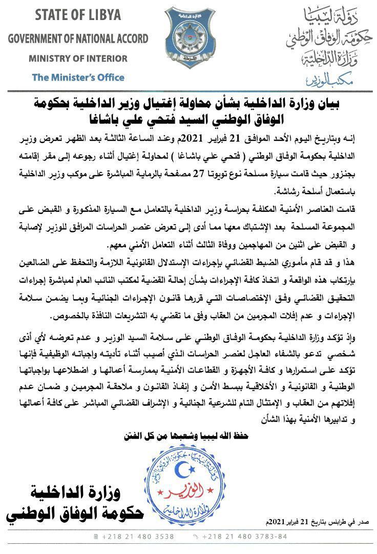وكان بيان صادر عن وزارة الداخلية بحكومة الوفاق قد أعلن تعرض وزير الداخلية بالحكومة فتحي باشا آغا ظهر اليوم الأحد 21 فبراير/شباط 2021 لمحاولة اغتيال أثناء رجوعه لمحل إقامته في منطقة جنزور (20 كم غرب طرابلس).