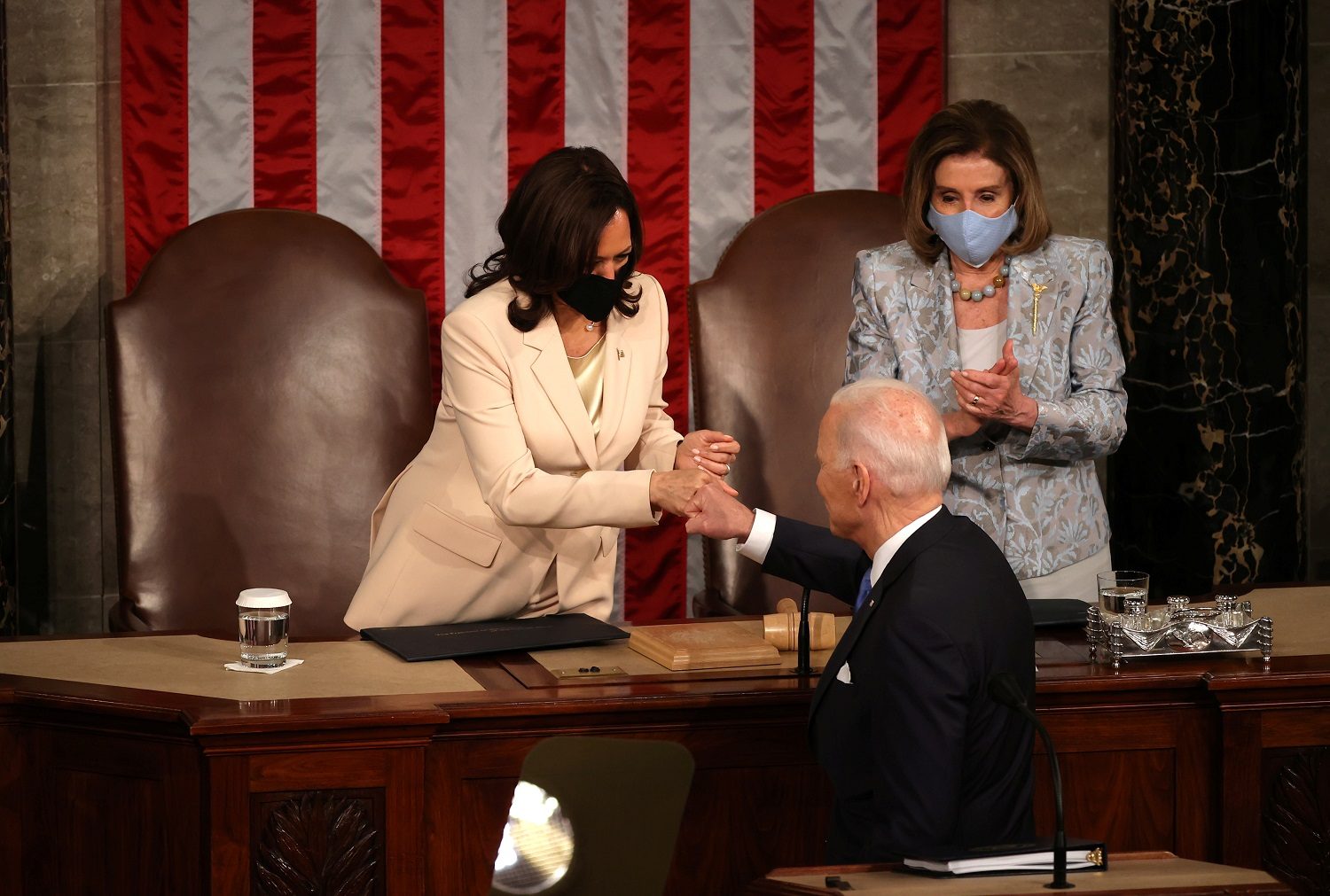 لم تفُت هذه اللحظة على الرئيس الأمريكي جو بايدن، والذي خاطبهما بالقول: “السيدة رئيسة مجلس النواب، والسيدة نائبة الرئيس… لم يحدث أن قال رئيس أمريكي تلك الكلمات من قبل من على هذه المنصة. وحان الوقت لقولها”.