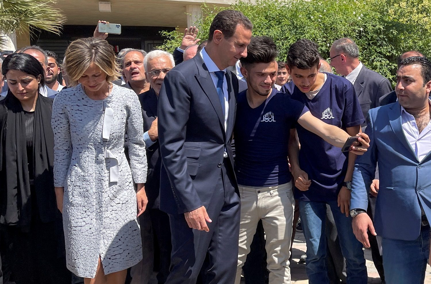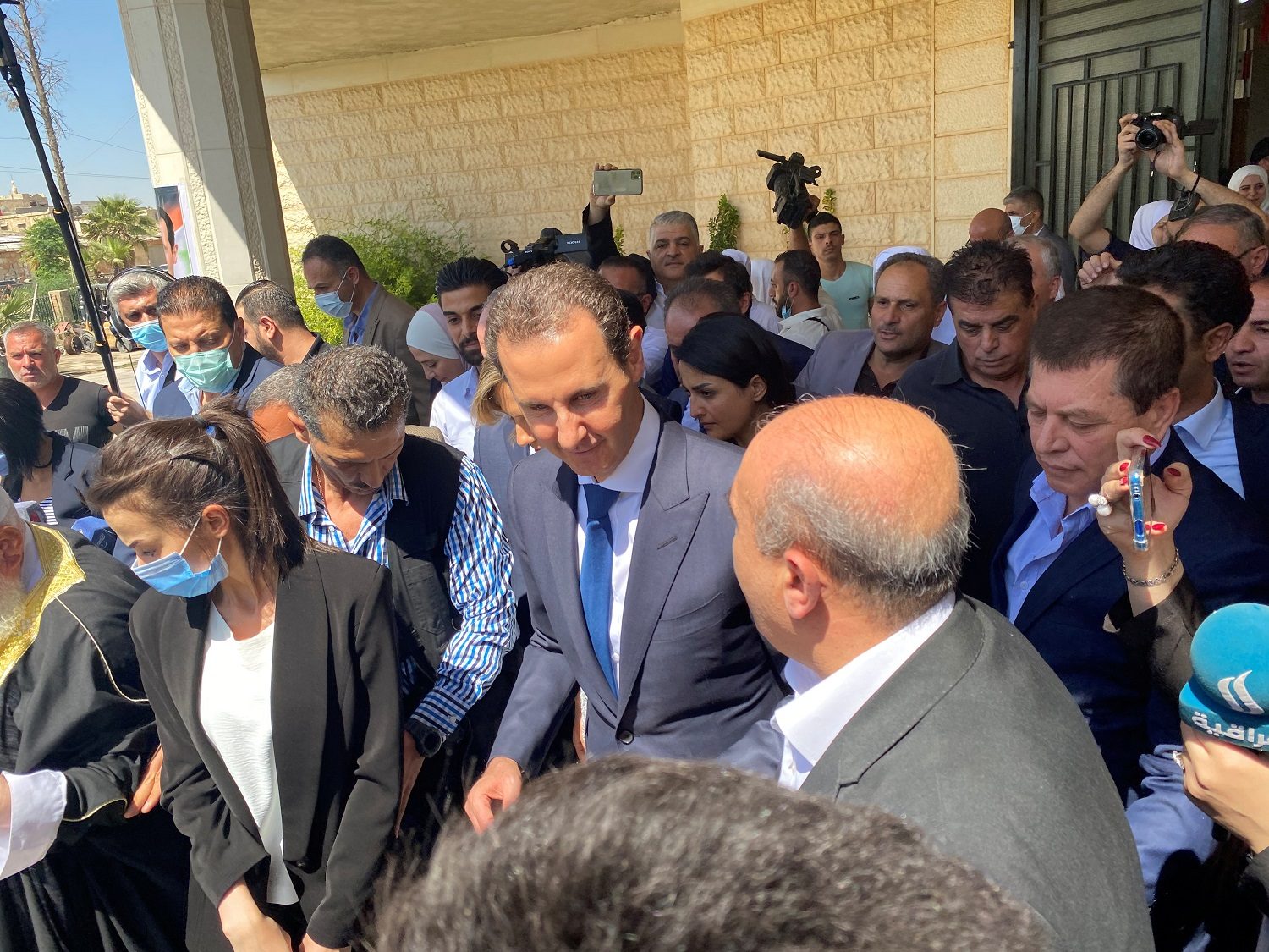 بدا ظهور الأسد مخططاً له بشكل جيد، فقد ظهر برفقة زوجته أسماء، محاطاً بالعشرات من مؤيديه، وسط حضور واضح لوسائل الإعلام العالمية.