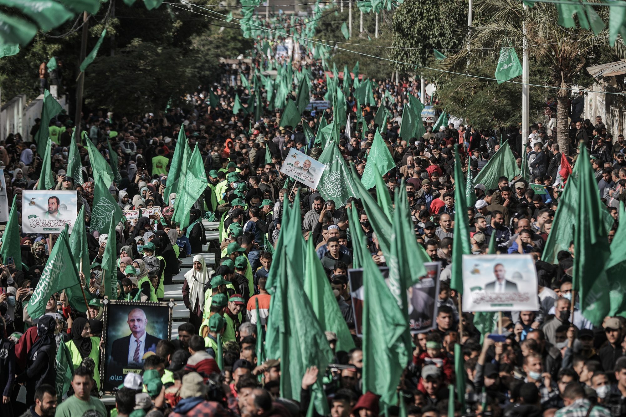 فيما رفع المشاركون الأعلام الفلسطينية ورايات الحركة، يتقدمهم عدد من قيادات حماس والفصائل الفلسطينية.