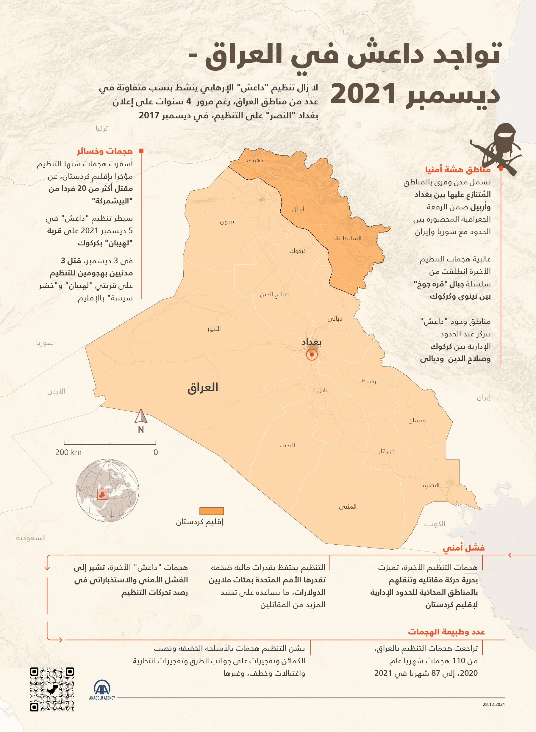 كان التنظيم قد سيطر على نحو ثلث مساحة العراق في صيف 2014، قبل أن تعلن بغداد استعادة كامل أراضي الدولة في 2017، لكن خلايا نائمة للتنظيم ما زالت تنتشر في مناطق واسعة هي المسؤولة عن الهجمات التي تشهدها البلاد.