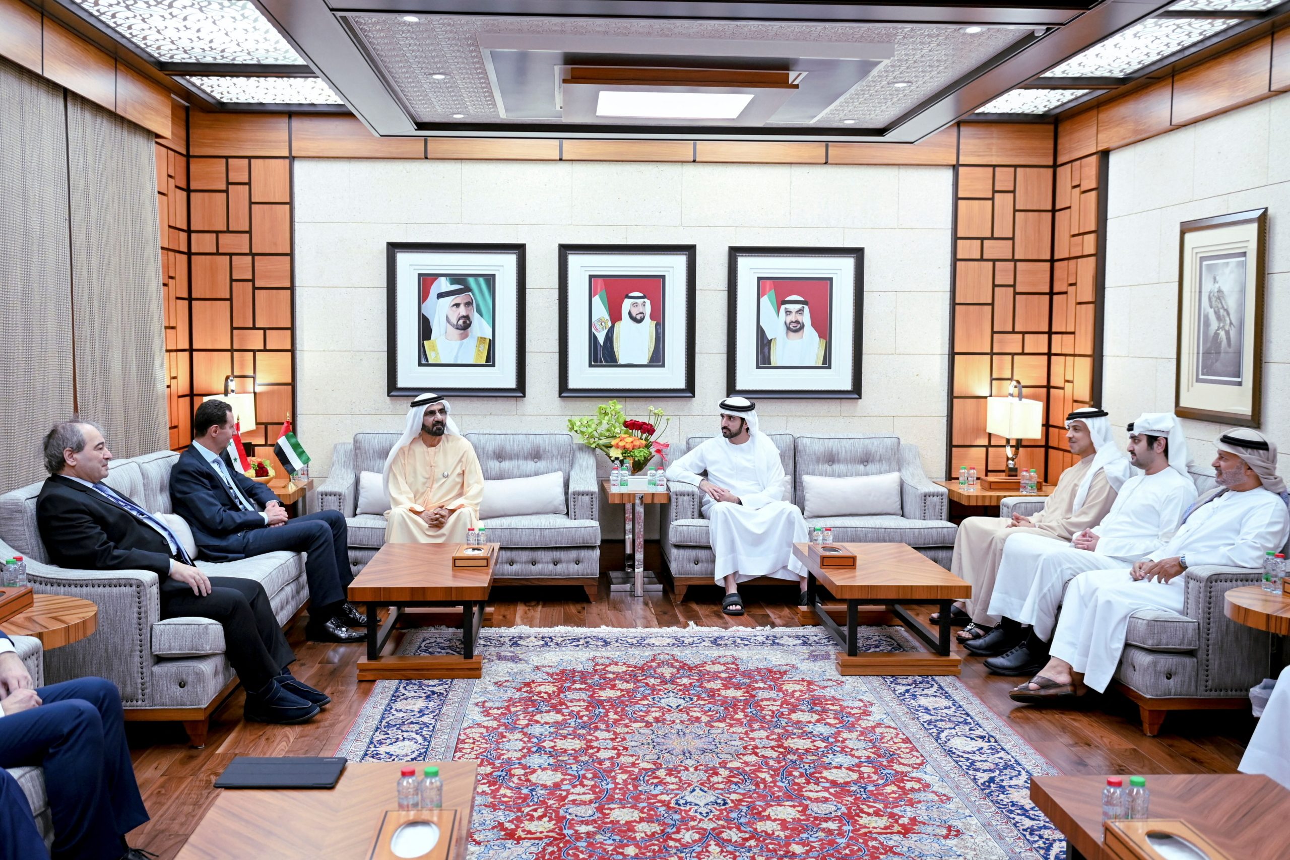 عندما حطَّت في دبي بعد نحو 4 ساعات، كان في استقبال رئيس النظام السوري الشيخ محمد بن راشد آل مكتوم، حاكم إمارة دبي، يرافقه أبناؤه حمدان بن محمد بن راشد آل مكتوم، ومكتوم بن محمد آل مكتوم، وزير المالية الذي تسارع بروزه في الساحة السياسية الإماراتية في الفترة الأخيرة.