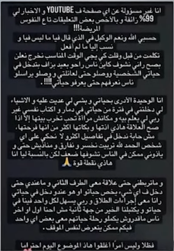 ومن خلال حسابها على إنستغرام كتبت سمارة: “حسبي الله ونعم الوكيل في الذي قال فيَّ ما ليس فيَّ، ونَسَب إليَّ ما لم أفعل.. معي إجراءات الطلاق، وربّي يسهّل لكلّ واحد فينا”.