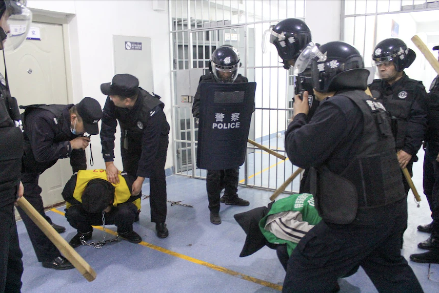 بينما تُظهر صورة أخرى على ما يبدو تدريباً للشرطة مع حراس يحملون هراوات ويحاولون السيطرة على شخص مقيّد بسلاسل.