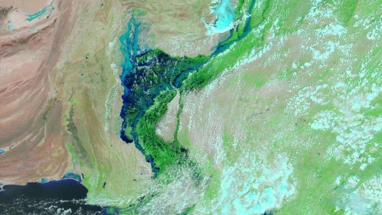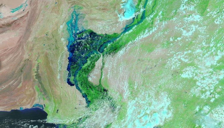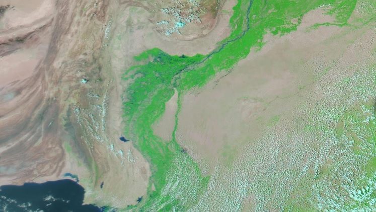كشفت صور مذهلة التقطتها الأقمار الاصطناعية حديثاً عن مدى الاتساع غير المسبوق للفيضانات التي تعرضت لها باكستان، حتى إن فيضان نهر السند بالمياه حوَّل جزءاً من مقاطعة السند الباكستانية إلى بحيرة داخلية بعرض 100 كيلومتر.