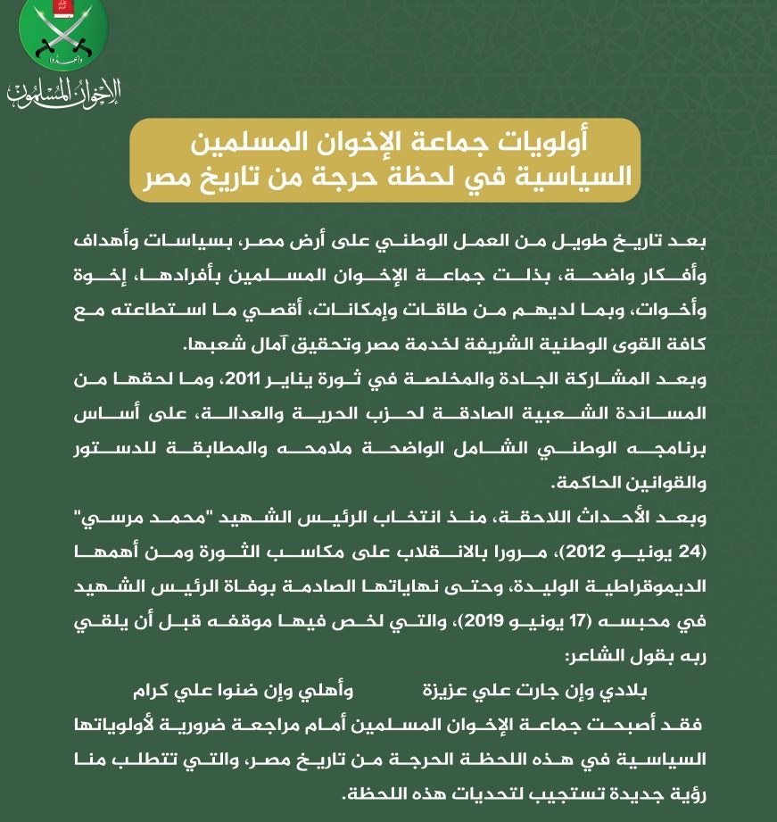 كشفت وثيقة داخلية صادرة عن جماعة الإخوان المسلمين في مصر، عن أولوياتها السياسية في المرحلة، التي وصفتها بالحرجة من تاريخ مصر، مؤكدةً تجاوز الجماعة الصراع على السلطة، لأن الغاية السياسية العامة لها هي ضمان حق الشعب في ممارسة سيادته على الحكام.