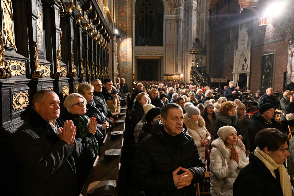 المصلون يصلون خلال قداس عيد الميلاد في مدينة لفيف غرب أوكرانيا/Getty Images