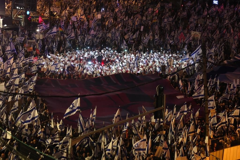 احتشد الإسرائيليون في شوارع المدن، السبت 11 مارس/آذار 2023 في مظاهرات خرجت على مستوى إسرائيل ودخلت الآن أسبوعها العاشر للاحتجاج على خطط الحكومة اليمينية المتشددة للحد من سلطات المحكمة العليا، والتي يعتبرها منتقدوها تهديداً لاستقلال القضاء، حيث شهدت الاحتجاجات وقوع بعض الإصابات والاعتقالات بين المتظاهرين.
