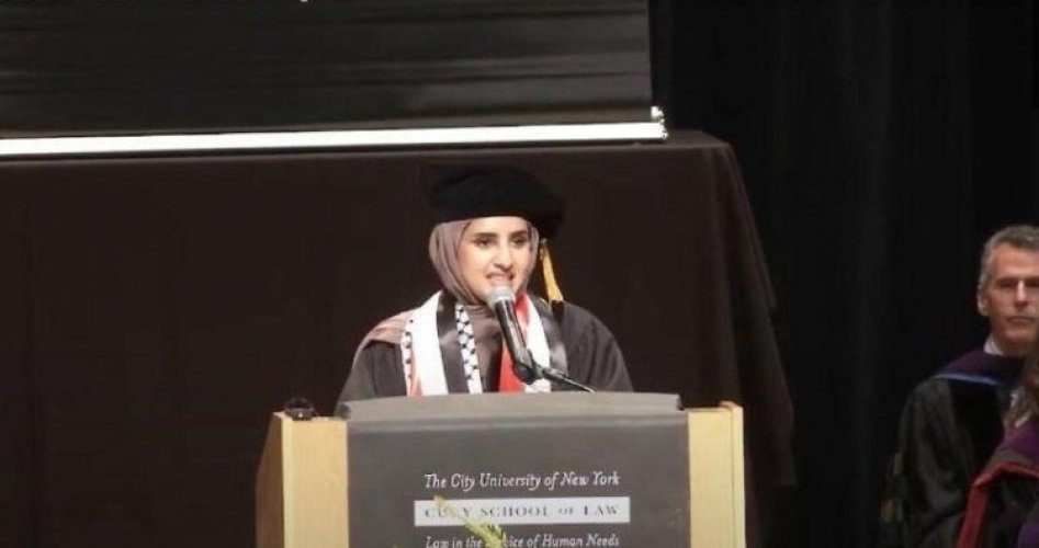 الموقع البريطاني أوضح أنه في 12 مايو/أيار، حُذف مقطع فيديو لحفل تخرج كلية الحقوق بجامعة كوني في نيويورك (Cuny) من صفحتها على يوتيوب بعد ساعات من الحفل.