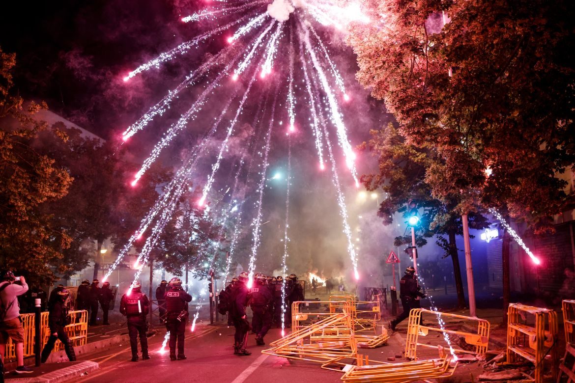 متظاهرون يلقون الألعاب النارية على شرطة مكافحة الشغب خلال الاشتباكات في نانتير