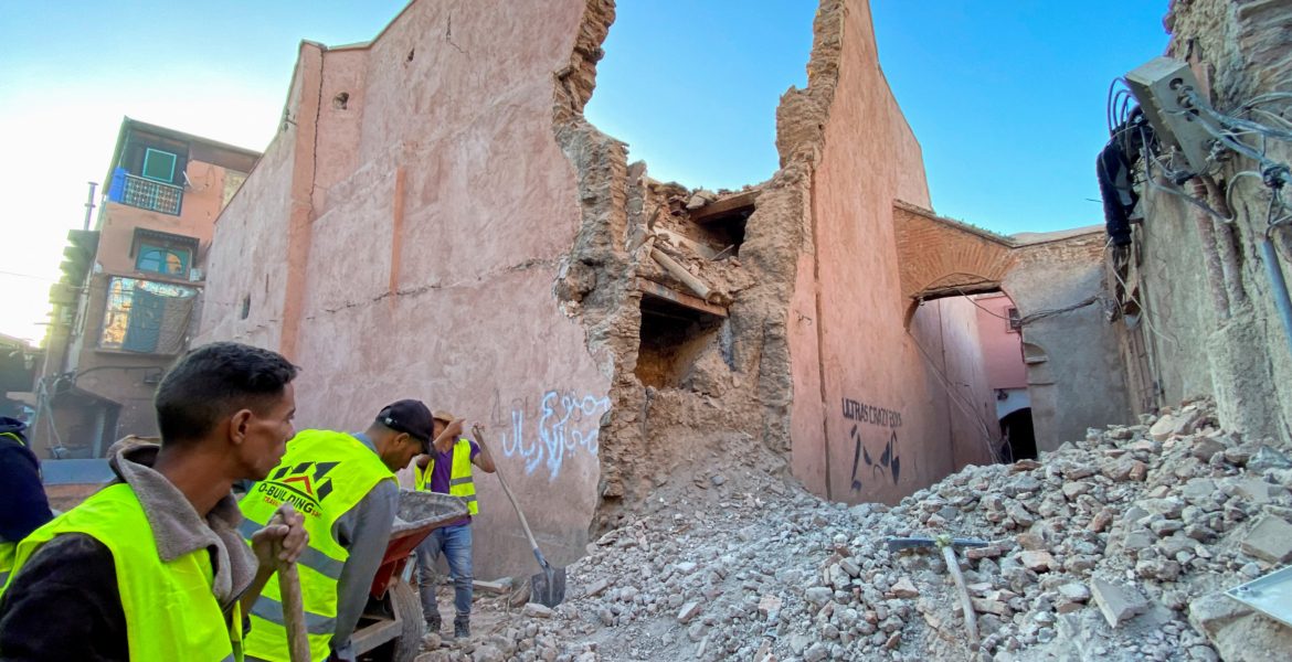 أشخاص يعملون بجوار الأضرار في مدينة مراكش التاريخية في أعقاب زلزال قوي ضرب المغرب/رويترز