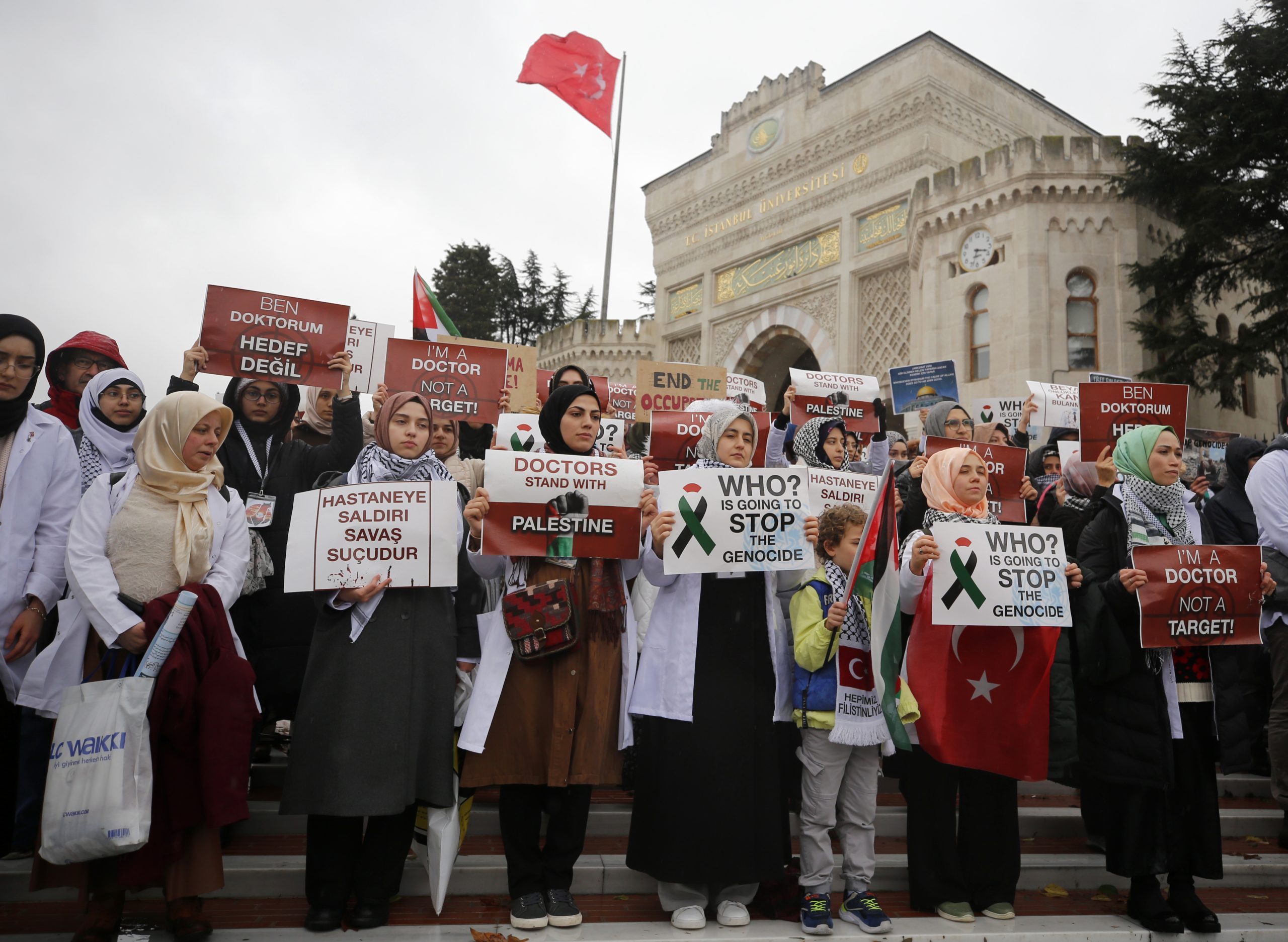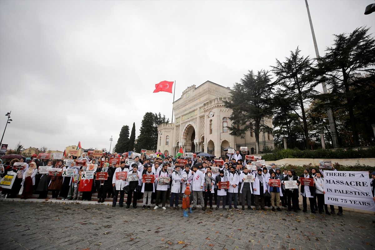 وتجمع الأطباء في حديقة “سراج خانة” بمنطقة الفاتح في إسطنبول مرتدين مآزر ملطخة بالدماء ثم ساروا إلى ساحة “بيازيد” بالمنطقة ذاتها.