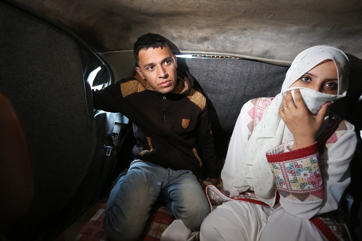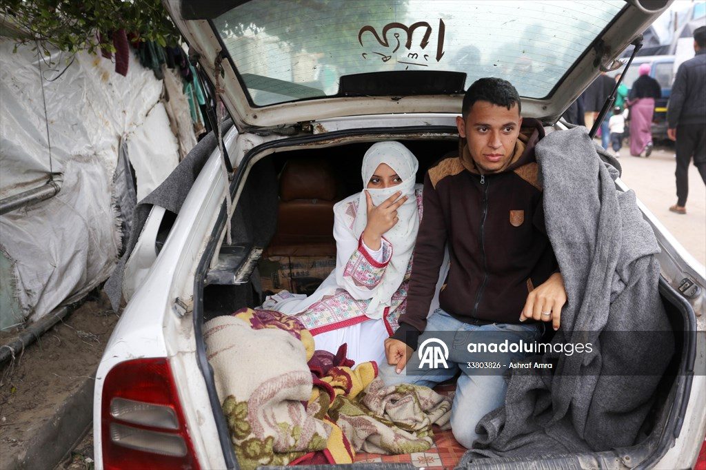 في سيارة بمدينة دير البلح وسط قطاع غزة، بدأ العروسان الفلسطينيان إبراهيم ونرمين أولى لياليهما بداخلها بعد أن أقاما مراسم الزواج داخل مدرسة تستضيف نازحين في وسط قطاع غزة.