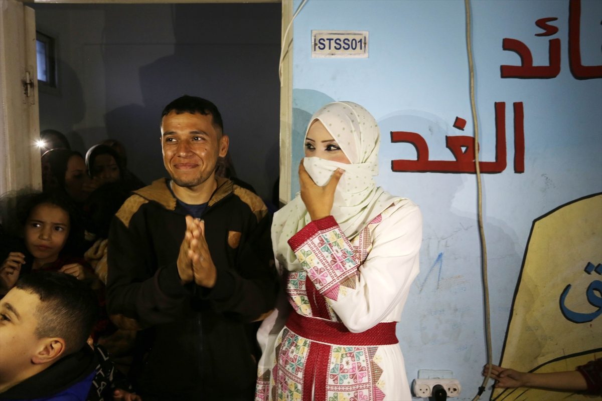 داخل مدرسة “دير البلح”، نظم أقارب العروسين والنازحون حفل زفاف صغيراً، حيث تم الاستماع لبعض الأغاني المفضلة لدى العروسة، وتبادل الزغاريد.
