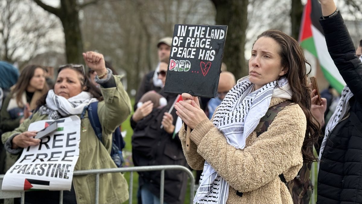 ورفع المتظاهرون أعلاماً فلسطينية، ووضع المئات منهم الكوفية، تعبيراً عن تضامنهم مع فلسطين، كما رفعوا شعارات منددة بالاحتلال الإسرائيلي وجرائمه المستمرة في القطاع، ومطالبة بمحاسبته.