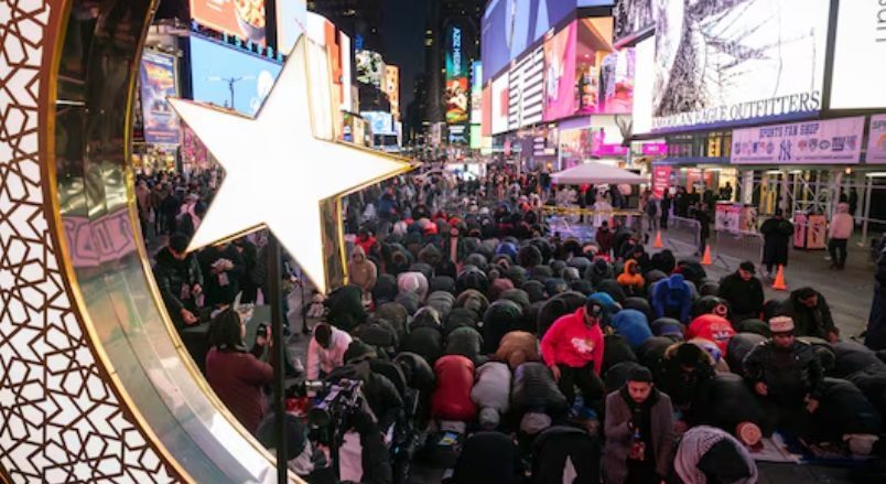 أعضاء الجالية المسلمة يتجمعون لأداء صلاة التراويح خلال شهر رمضان في تايمز سكوير بنيويورك