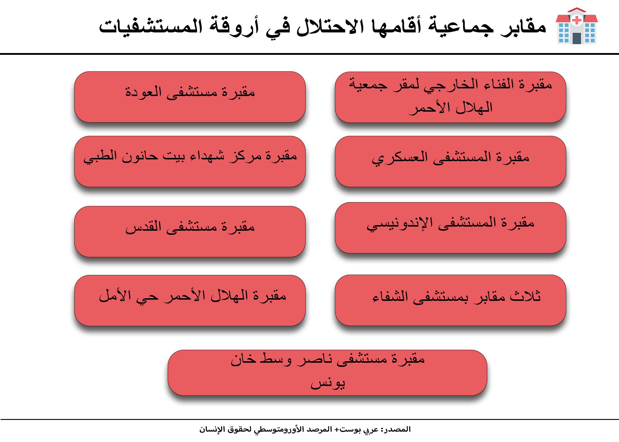 وفي خان يونس تنتشر المقابر الجماعية التي أقامها الاحتلال الإسرائيلي في كل من مستشفيي ناصر والهلال الأحمر المتواجد بحي الأمل، حسب ما أكدته مصادر بعين المكان لـ”عربي بوست”.