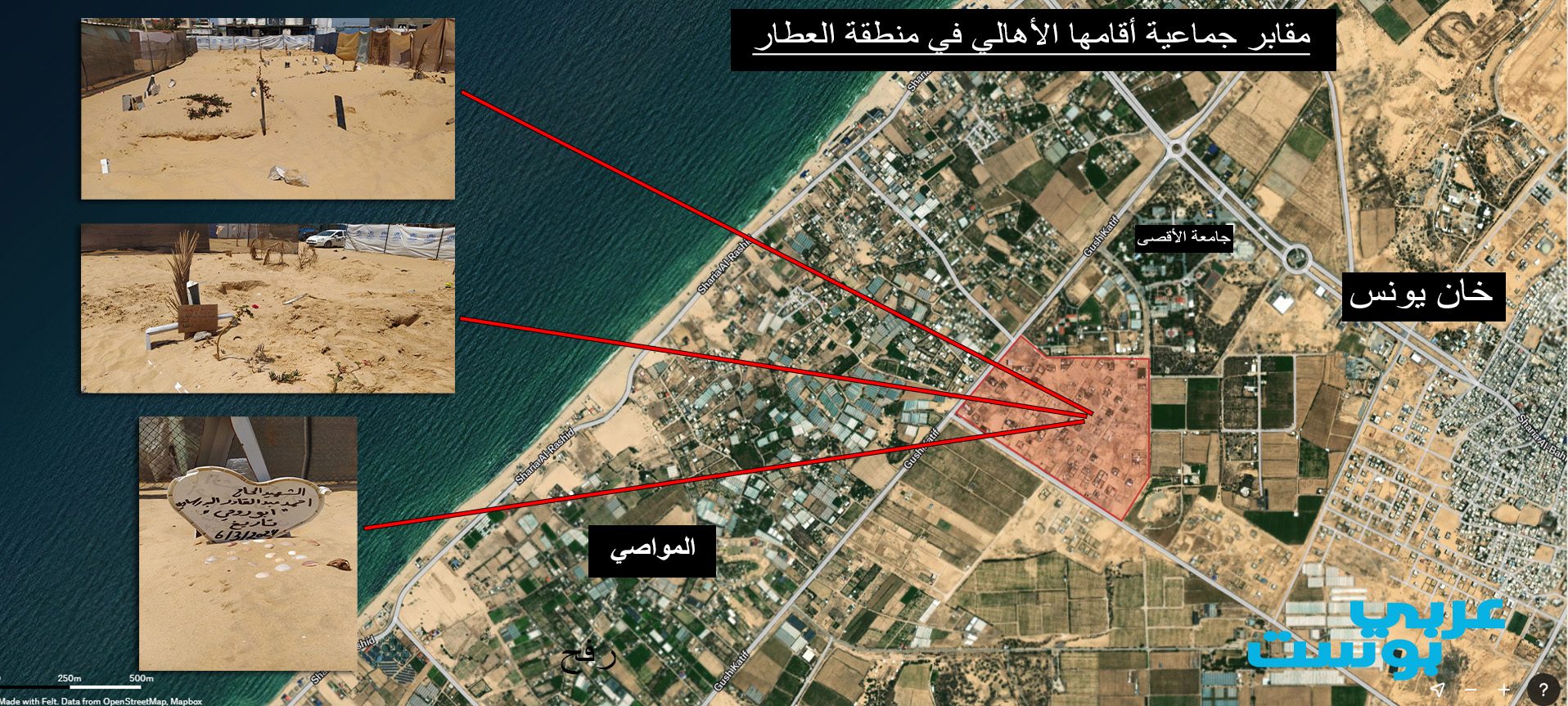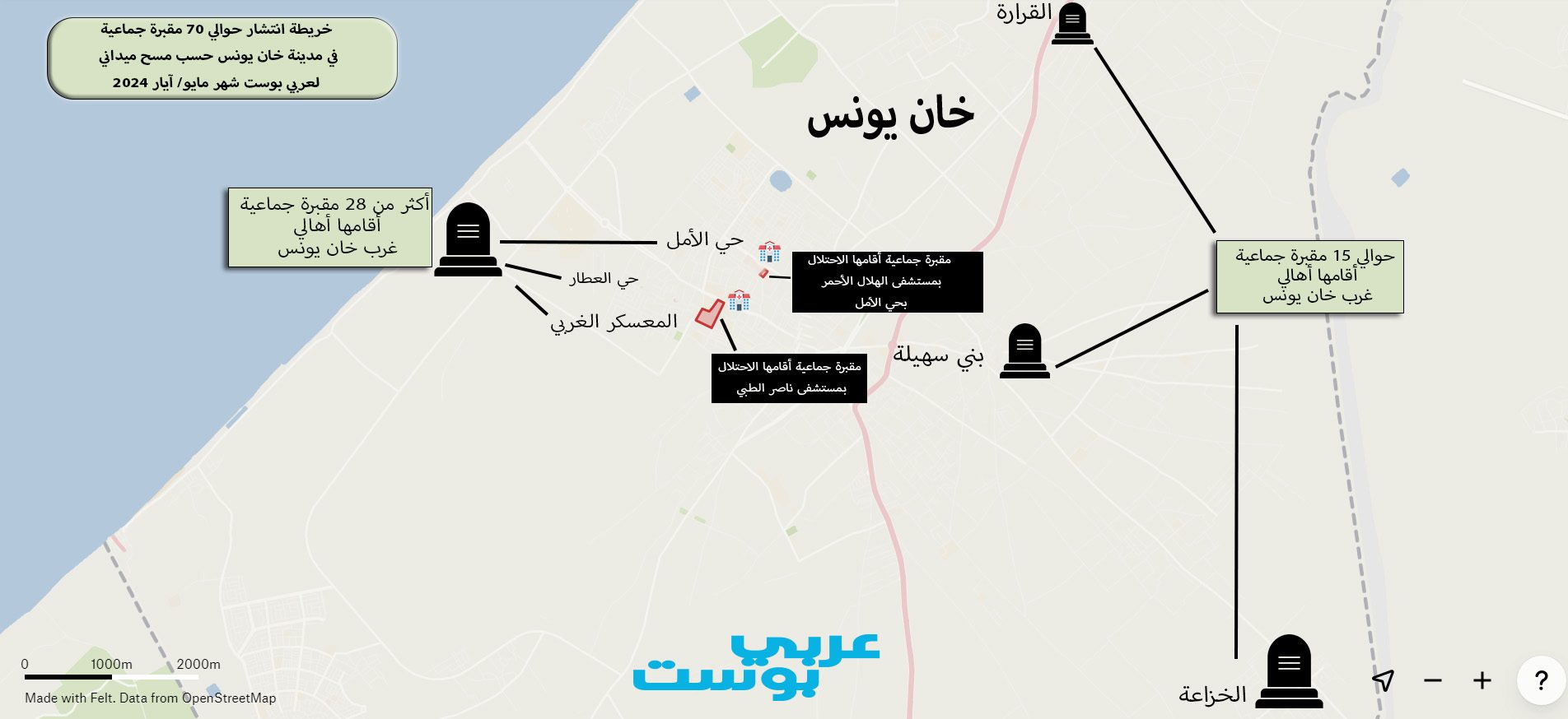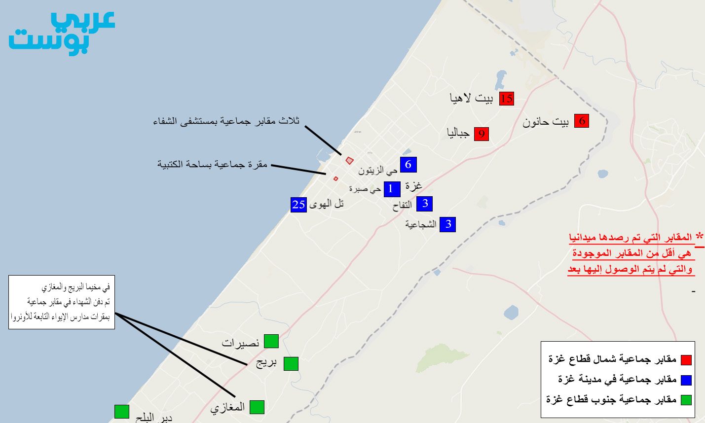 “عربي بوست” تتبع خريطة انتشار هذه المقابر الجماعية داخل قطاع غزة، استناداً لشهادات حية من المواطنين وصحفيين عايشوا ووثقوا هذه المقابر، إضافة لما هو متوفر من بيانات لدى لجان الطوارئ الحكومية وبيانات الجهات الدولية.